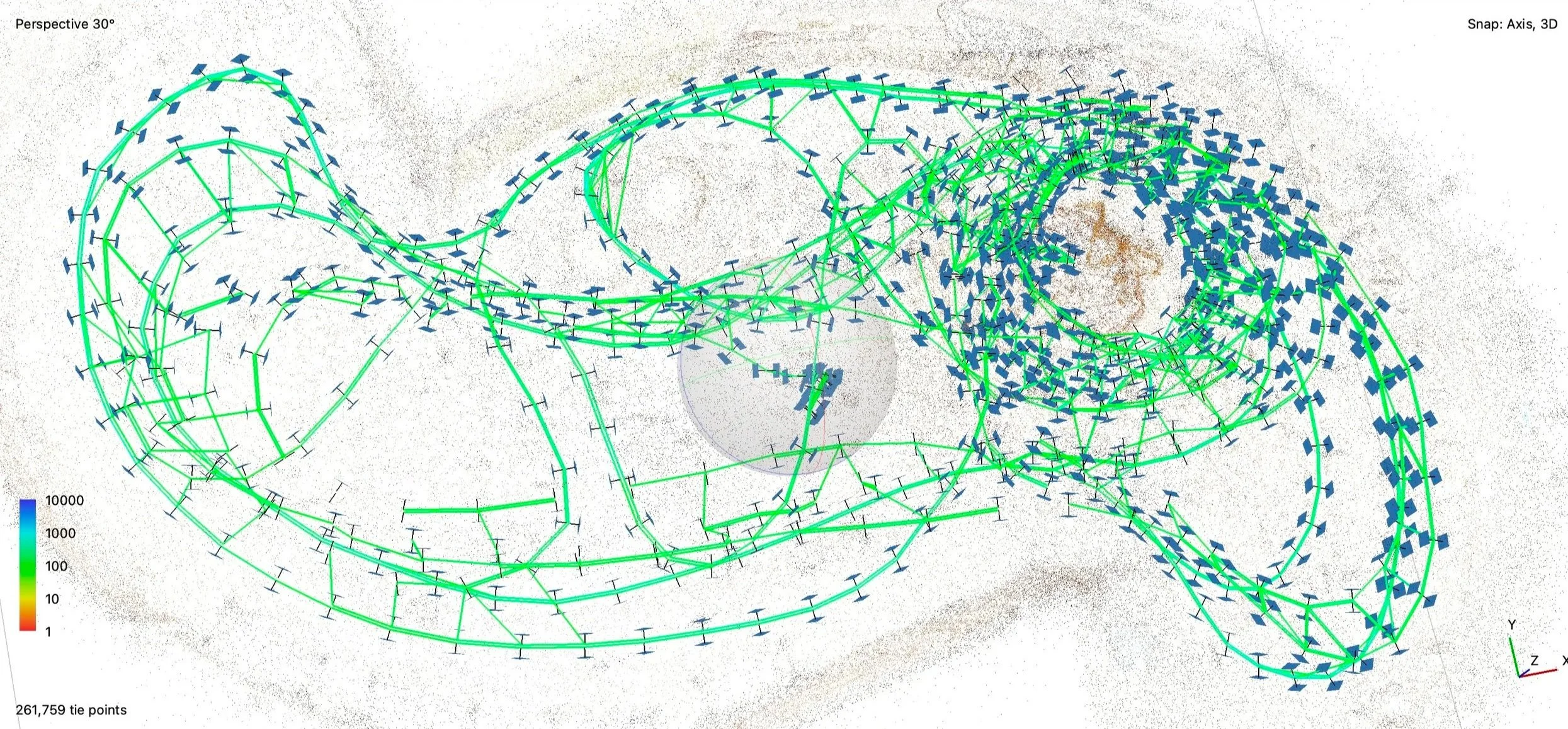 From the video capture, I generated approximately 1,300 fisheye images. These were aligned in Agisoft Metashape, a demanding step due to both the image count and the complexity of fisheye photography, but the full set was successfully aligned.