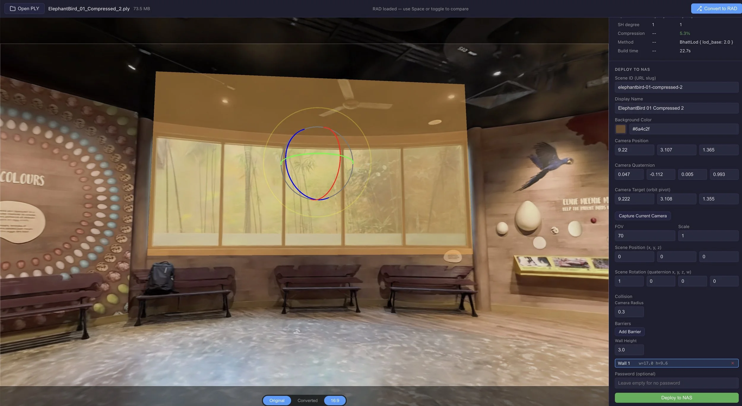 The resulting scene was refined and compressed in SuperSplat, a Gaussian splat editor under development by Will Eastcott. For web deployment, I then converted the scene from PLY to RAD format through a custom workflow based on Spark 2.0, an open-source Gaussian splat renderer from World Labs / SparkJS.